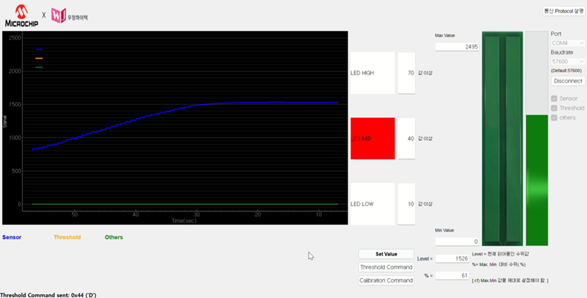 - 설정된 레벨 기준 50% 초과 시 LED 자동 점등